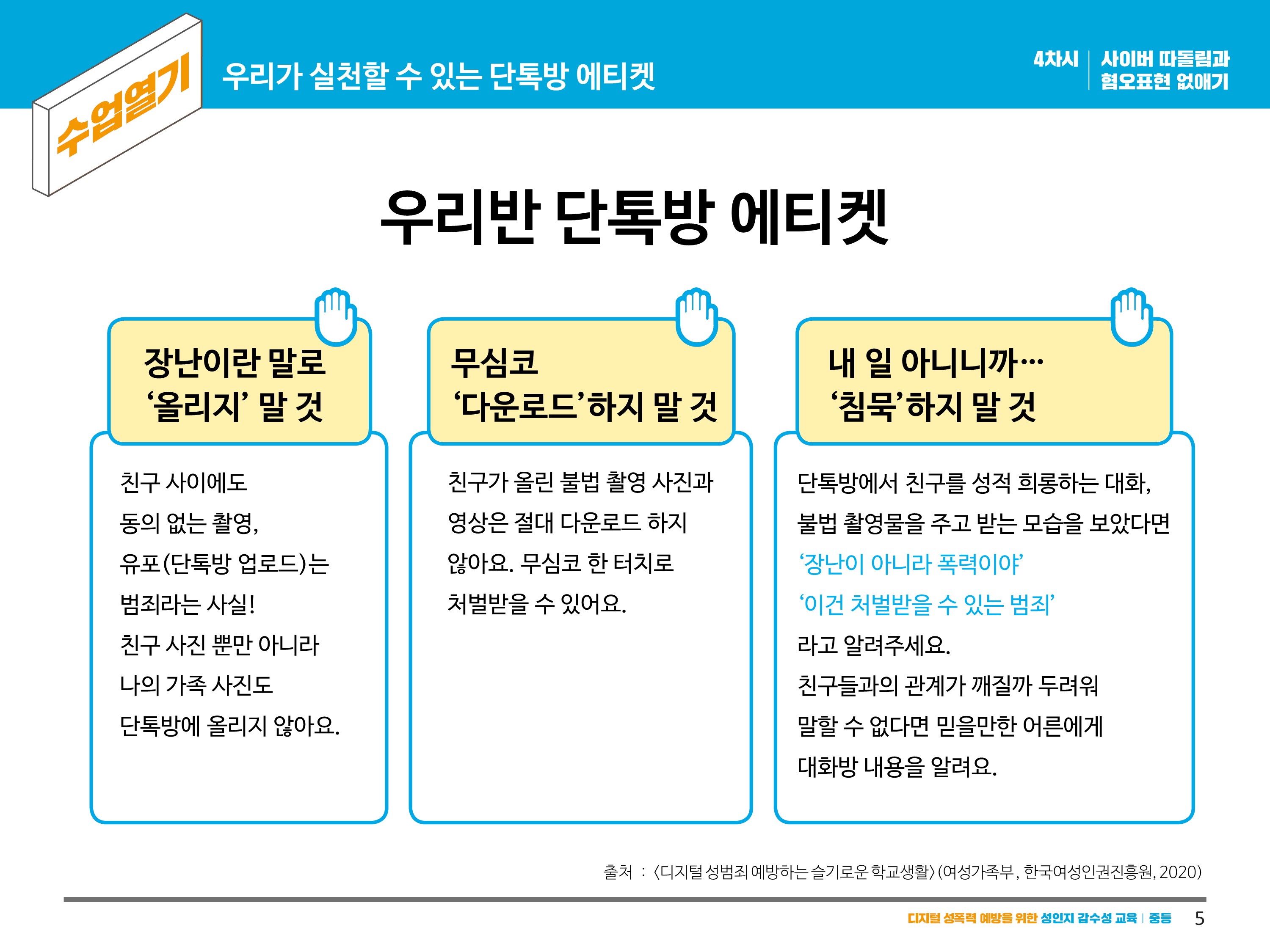 - 위의 사례와 같은 상황에서, 내가 단톡방에 있는 학생이라면 어떻게 반응했을 것 같은지 자유롭게 이야기를 나누어봅니다.