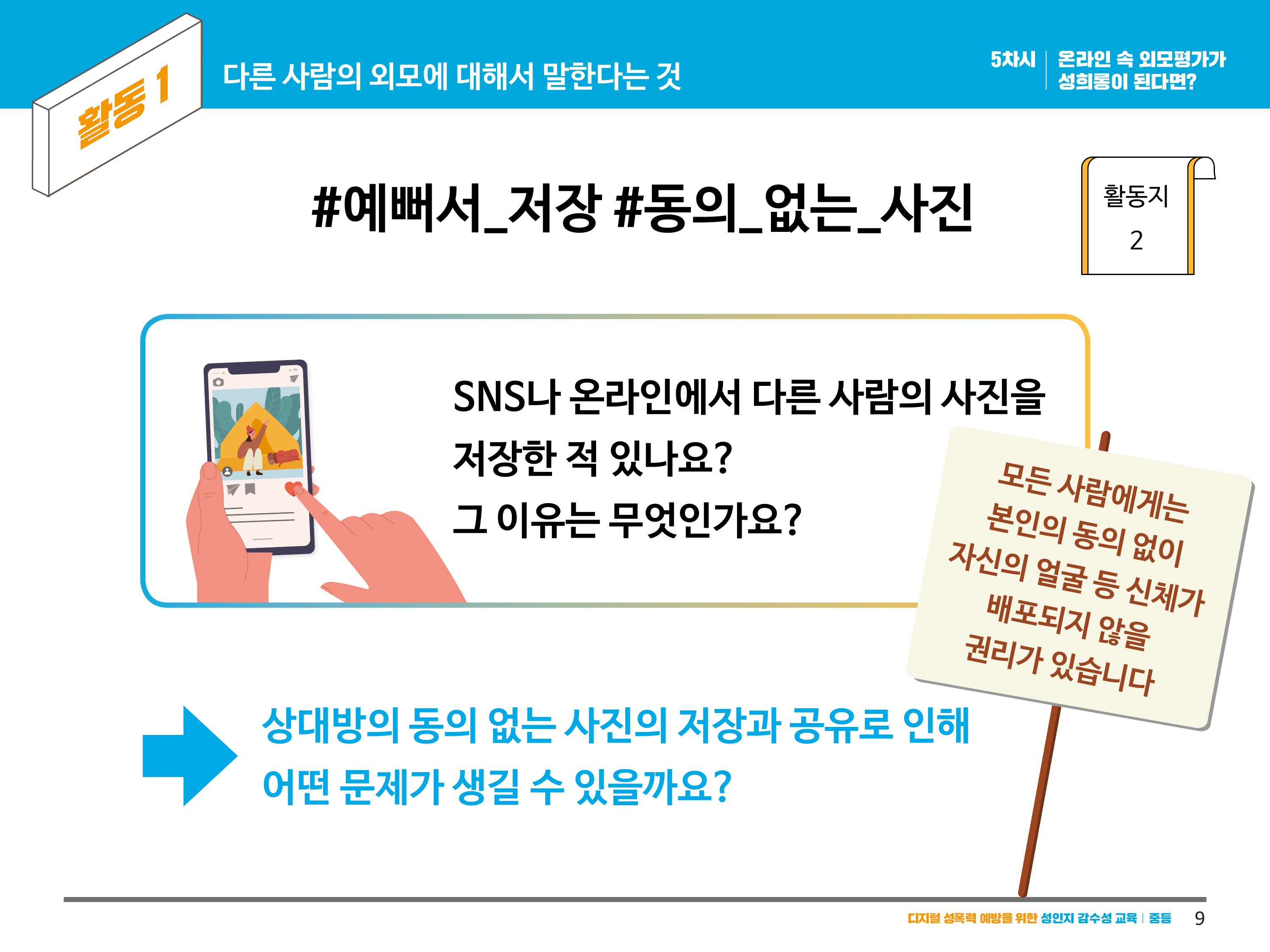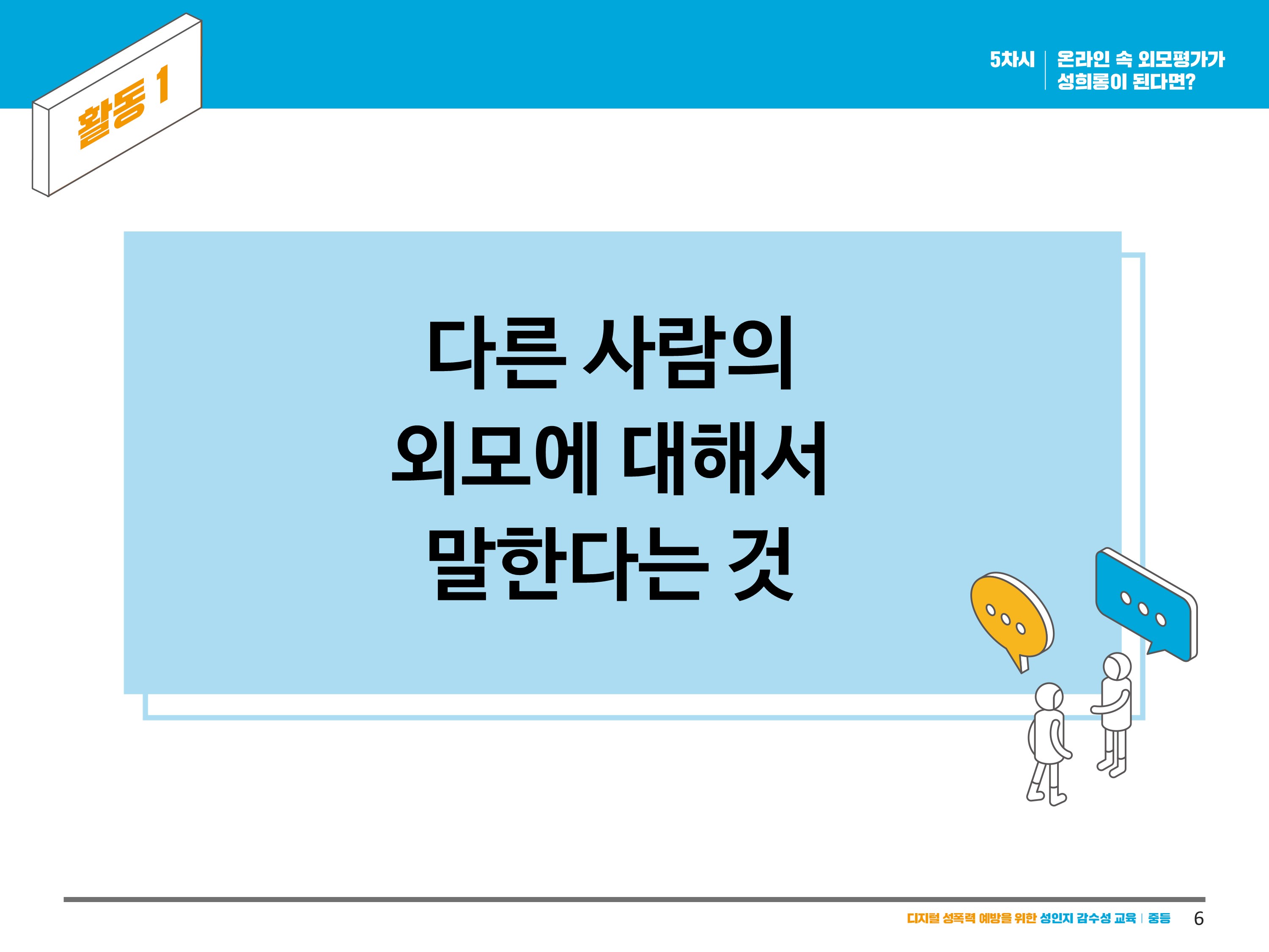- 온라인 속에서 이루어질 수 있는 외모평가에 대해서 생각해봅니다. 유명인이나 얼굴을 모르는 온라인 속 인물의 외모에 대해 이야기하는 것이 디지털 미디어의 특성(익명성, 비대면성 등)을 바탕으로 더 쉽게 이루어질 수 있다는 것을 이해하도록 지도합니다.