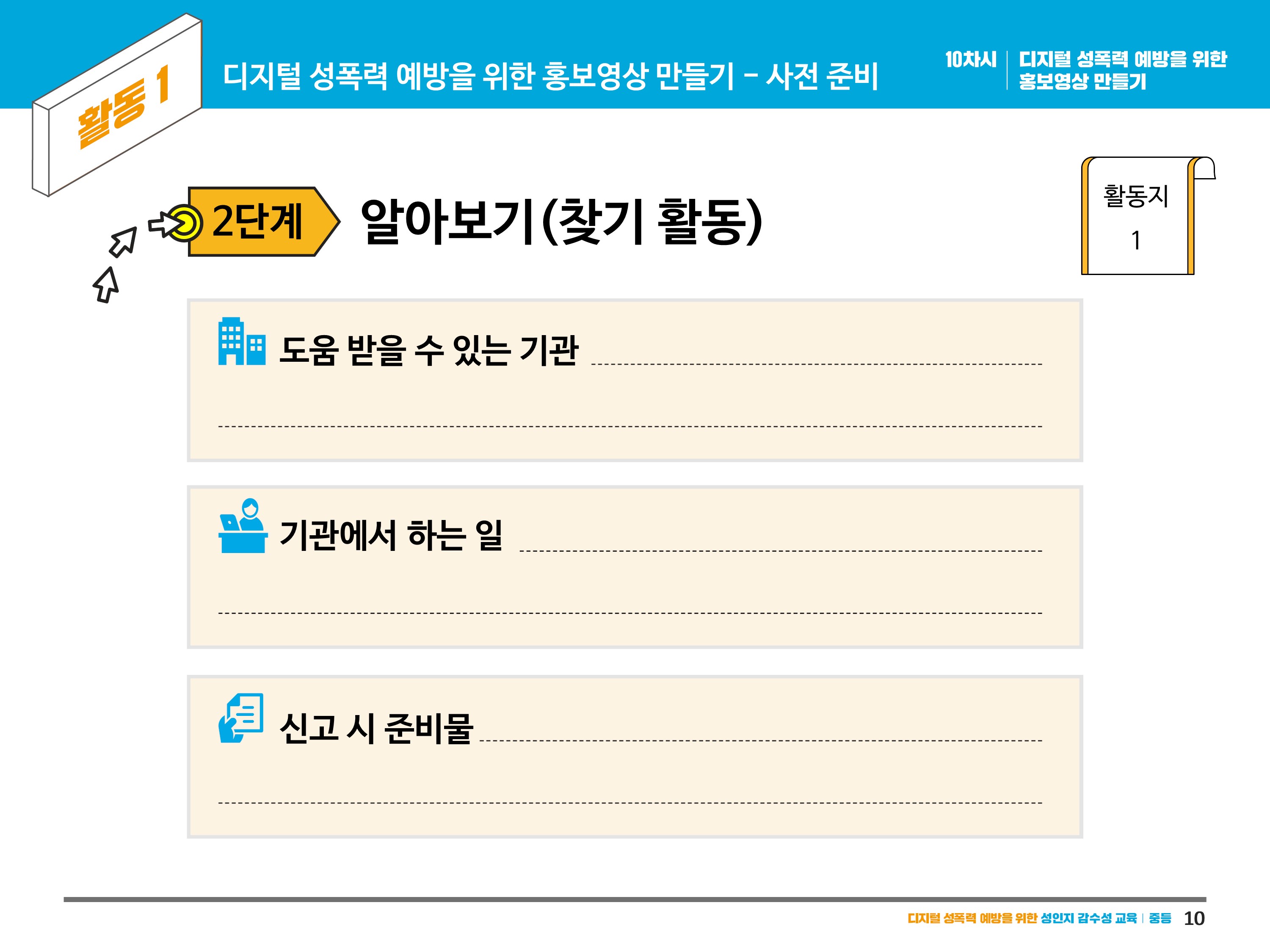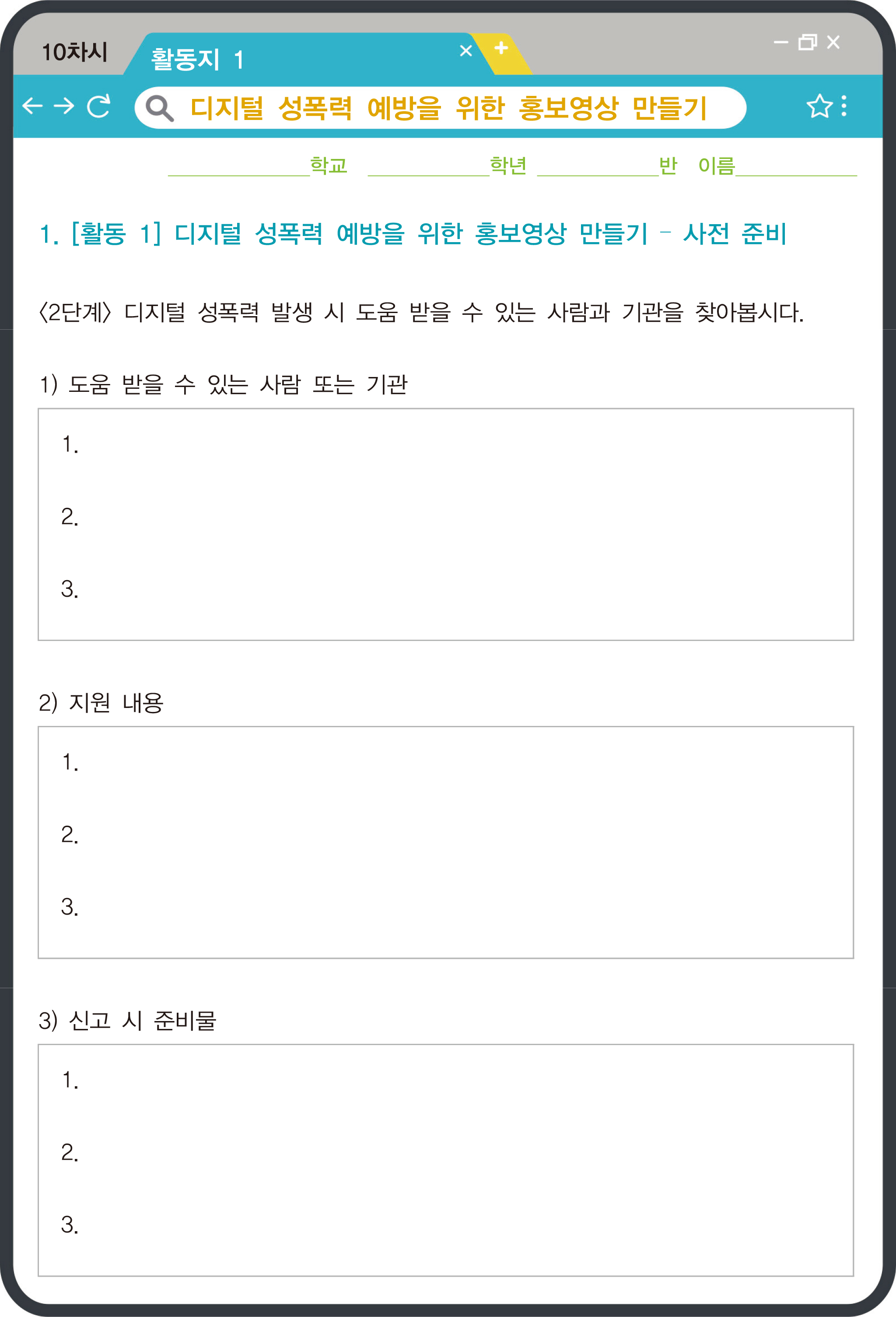 - 디지털 성폭력 관련하여 도움을 받을 수 있는 기관 찾기, 기관에서 하는 일, 지원받을 수 있는 내용, 신고할 때 필요한 것, 준비할 것 등을 알아보고 활동지에 기록합니다.
